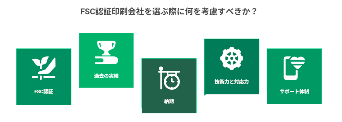 FSC認証を取得している印刷会社かどうかが重要です。認証を受けた会社だけが、公式マークを印刷物や広告に使用できます。公式FSCマークは、認証の正確性と信頼性を保証します。