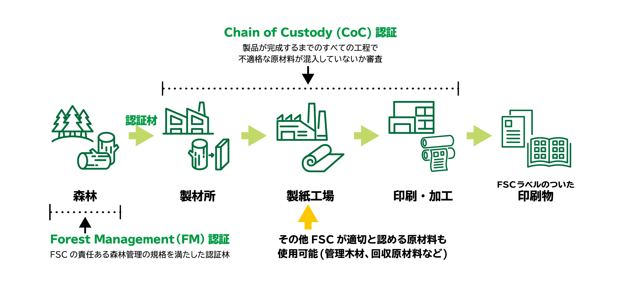 FSC認証印刷では、印刷プロセス全体にわたってFSC基準が適用されます。これには、認証紙の使用、インクやその他の材料の選定、廃棄物管理などが含まれます。これにより、印刷物が環境に与える影響を最小限に抑えることができます。
